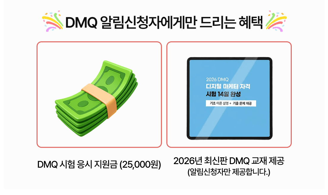 [사전알림신청] 제10회 DMQ 마케팅 자격증, 시험 응시 지원금 + 교재 무료